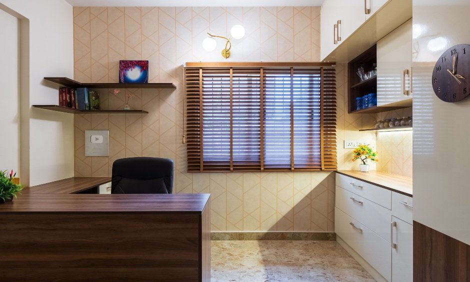 Design Cafe’s team planned his home interiors with statement walls in all rooms, space saving furniture. The living room, dining room and kitchen were designed with blue as the dominant colour palette to meet their requirement.